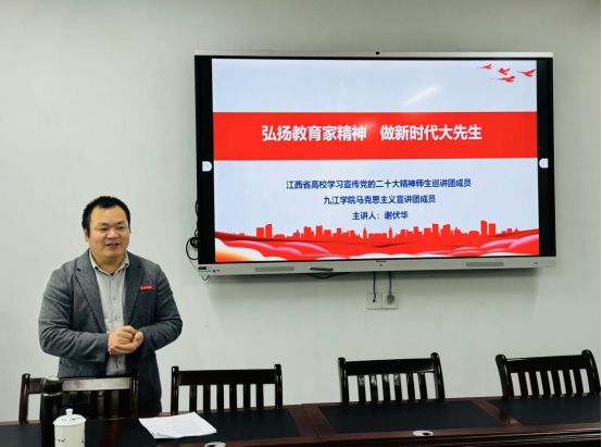为深入学习贯彻习近平总书记关于教育的重要论述,大力弘扬教育家精神,进一步提升学院师德师风建设水平。11月20日,马克思主义学院副院长谢伏华博士为kaiyun教职工开展了一场以“弘扬教育家精神, 做新时代大先生”为主题的师德师风宣讲活动,此次活动由院党委书记王英姿主持。