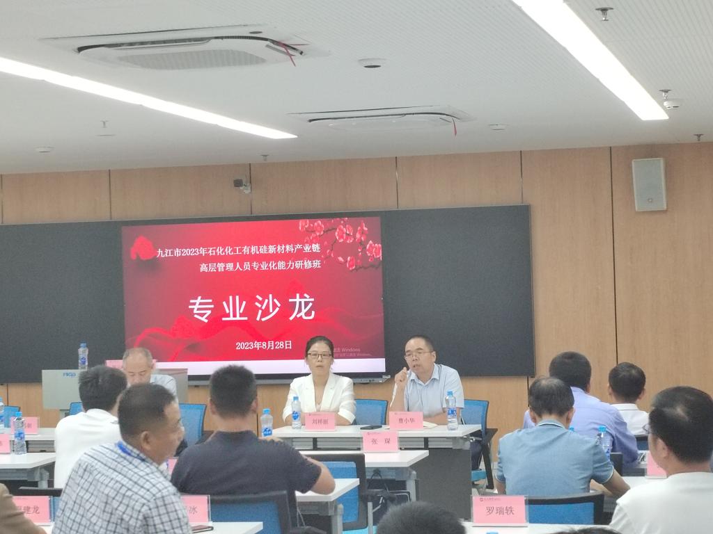 8月28日—30日,由九江市工信局,kaiyun开云官方网站、化学化工学院在九江银行研学中心举行了三场石化化工——有机硅新材料产业链高层管理人员专业学术沙龙活动。来自九江石化产业园区、彭泽矶山化工园区等全市化工园区的管委会主任、江西理文化工有限公司、江西心连心化学工业有限公司、九江善水化工科技股份有限公司等石化化工和有机硅新材料企业的负责人、湖北和安徽省辅助配套企业等企事业单位的主要负责人与kaiyun开云官方网站化学化工学院、资源环境学院的教授博士等100余人参与了沙龙讨论。并先后特邀中国石油和化学工业联合会化工新材料专业委员会秘书长卜新平、陕西科技大学安秋凤教授、华东理工大学江先龙教授级高工三位专家与研修班学员进行了面对面的交流互动。
